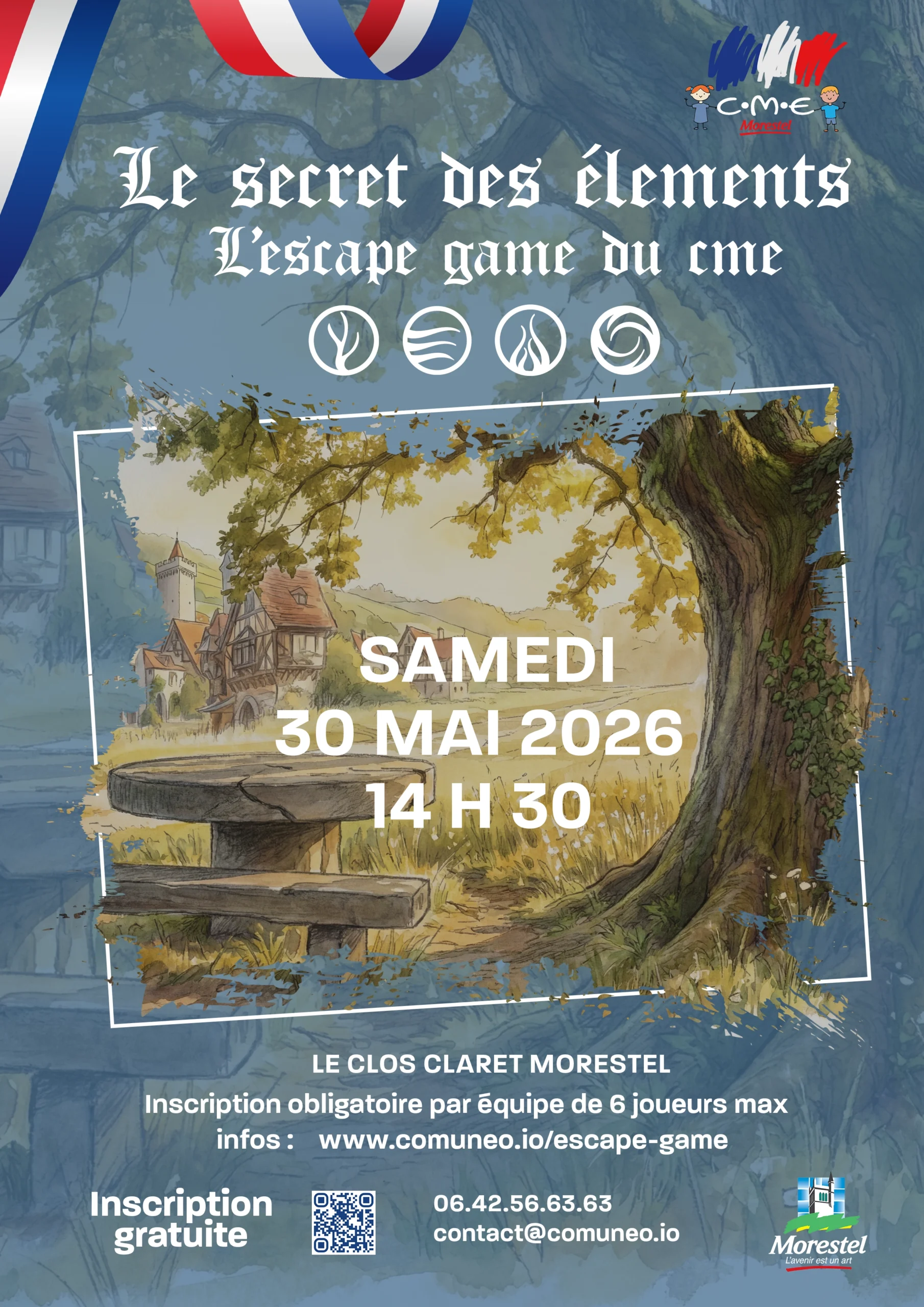 Le Conseil Municipal des Enfants (C.M.E.) de Morestel célèbre ses 30 ans avec un événement exceptionnel : un escape game géant au Clos Claret 🎉🔐 ! En famille, venez relever des énigmes, coopérer, explorer et partager un moment ludique imaginé par les enfants eux-mêmes. Tout au long de la journée, profitez aussi de nombreuses animations festives pour petits et grands : jeux, surprises et ambiance conviviale au rendez-vous. Une belle occasion de fêter cet anniversaire symbolique, de valoriser l’engagement des jeunes de la commune et de vivre une journée inoubliable à Morestel. On vous attend nombreux !